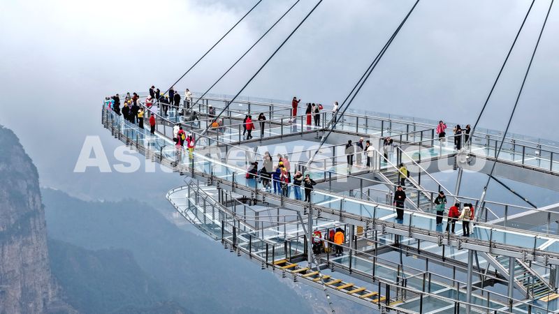 图片说明:2026年3月8日,游客在浙江省台州市仙居县神仙居景区南天顶玻璃观景台上游玩。