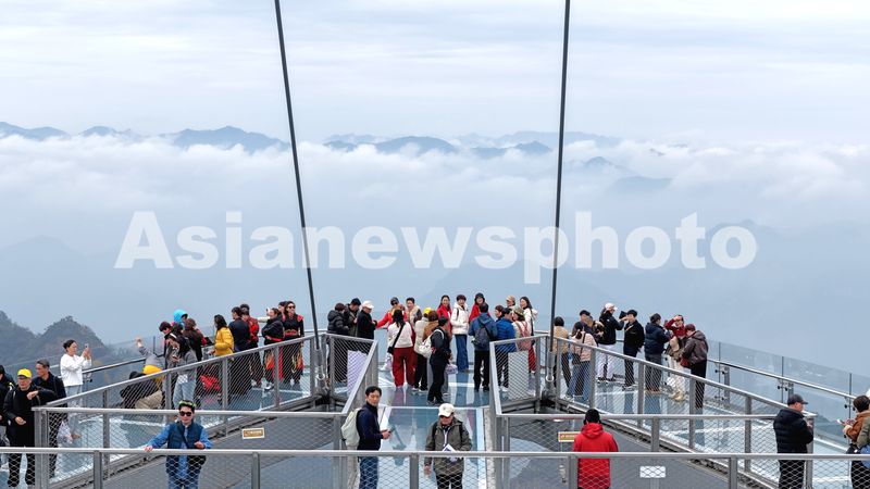 图片说明:2026年3月8日,游客在浙江省台州市仙居县神仙居景区南天顶玻璃观景台上游玩。