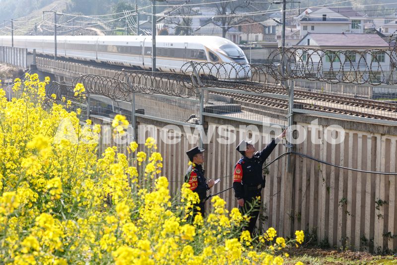 2026年3月10日,在沪昆高铁贵州省玉屏侗族自治县与湖南省新晃侗族自治县交界管线,铁路公安民警对铁路护栏进行安全排查。