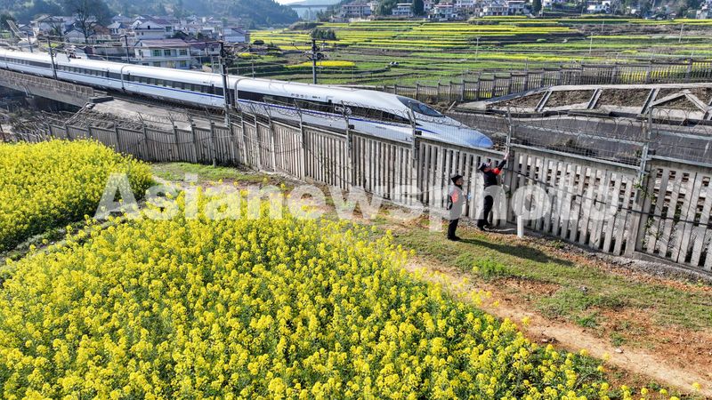 2026年3月10日,在沪昆高铁贵州省玉屏侗族自治县与湖南省新晃侗族自治县交界管线,铁路公安民警对铁路护栏进行安全排查。