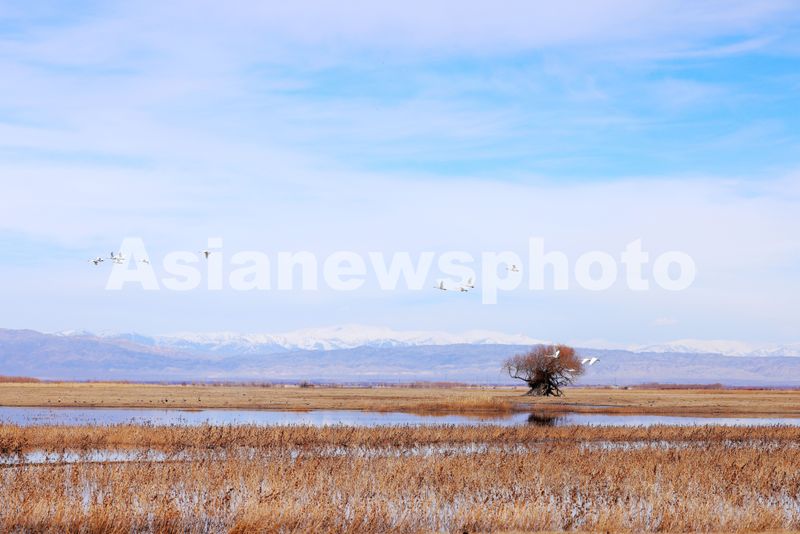 2026年4月1日,新疆阿勒泰科克苏湿地国家级自然保护区成群的天鹅自由自在地飞翔。