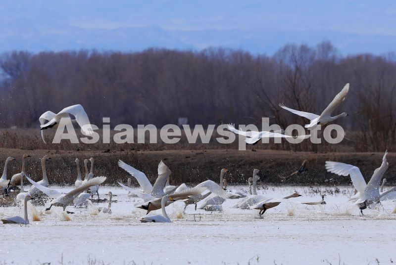 2026年4月1日,新疆阿勒泰科克苏湿地国家级自然保护区成群的天鹅自由自在地飞翔。