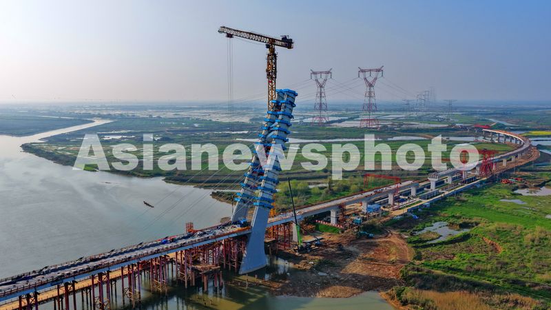 图片说明:2026年4月9日,位于江西省南昌市南昌县蒋巷镇鄱阳湖畔的将军洲大桥建设现场,工人在进行主桥主塔吊装施工。