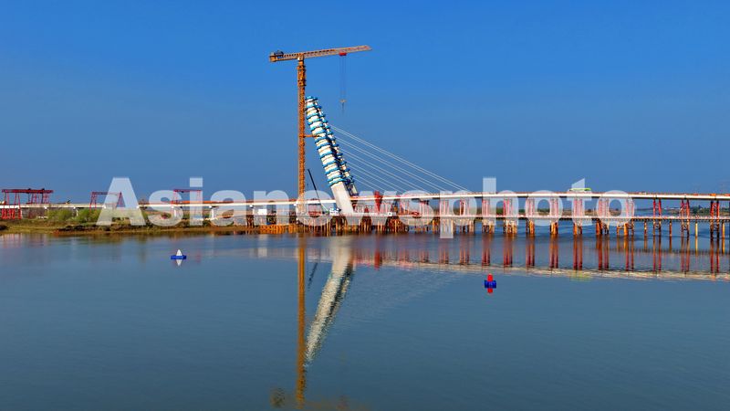 图片说明:2026年4月9日,位于江西省南昌市南昌县蒋巷镇鄱阳湖畔的将军洲大桥建设现场,工人在进行主桥主塔吊装施工。