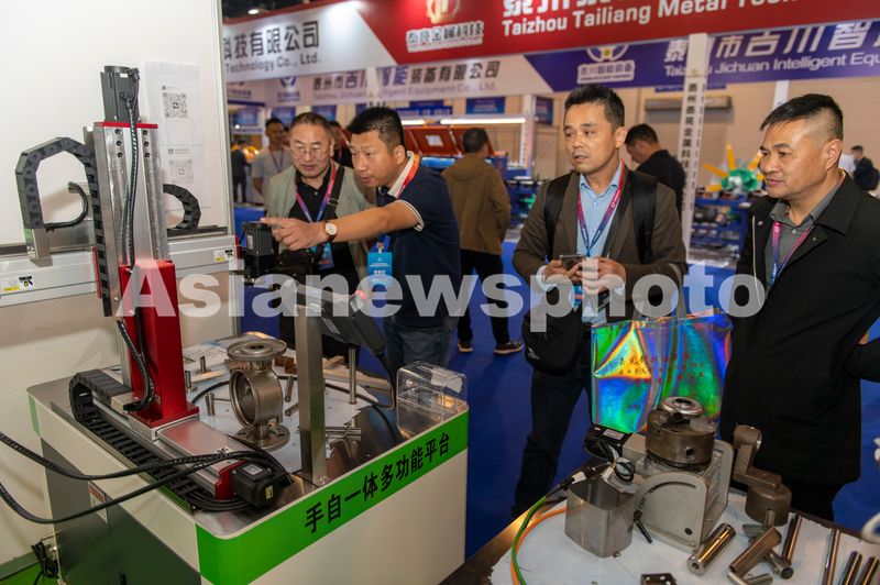 2026年4月10日,浙江省金华市,在永康市国际会展中心里,客商在考察全新的机械装备展示。
