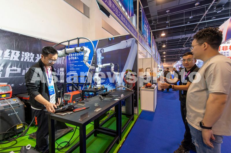 2026年4月10日,浙江省金华市,在永康市国际会展中心里,客商在考察全新的机械装备展示。