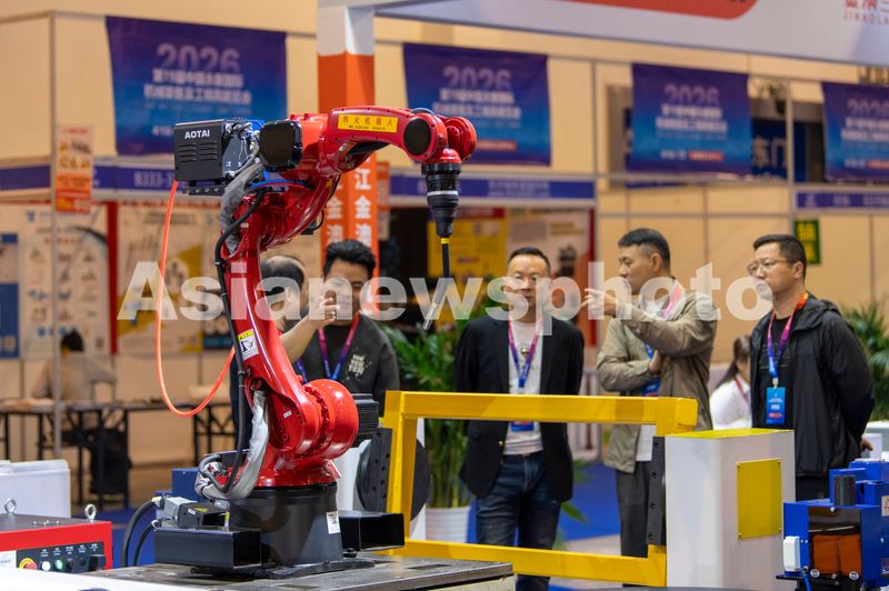 2026年4月10日,浙江省金华市,在永康市国际会展中心里,客商在考察全新的机械装备展示。