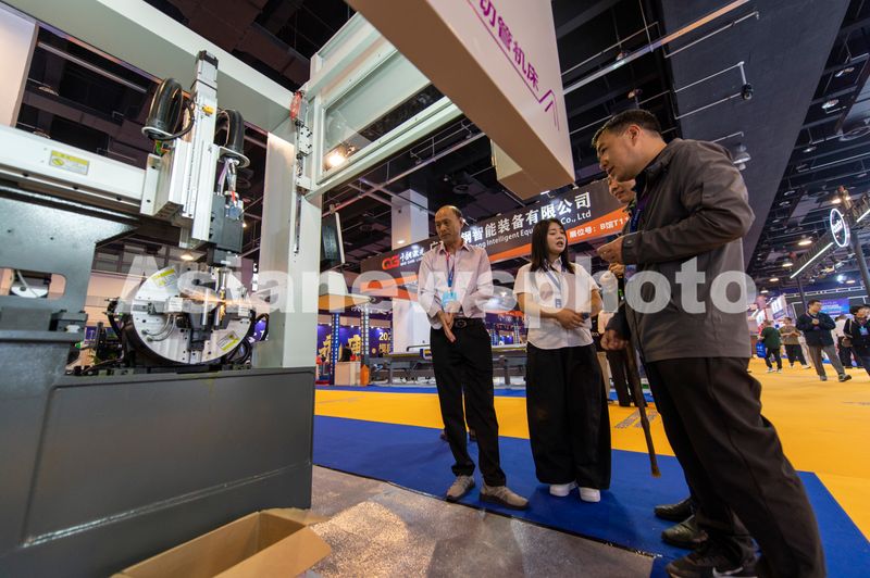 2026年4月10日,浙江省金华市,在永康市国际会展中心里,客商在考察全新的机械装备展示。