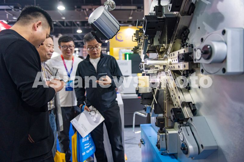 2026年4月10日,浙江省金华市,在永康市国际会展中心里,客商在考察全新的机械装备展示。