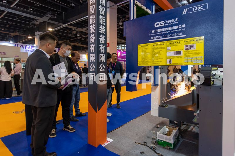 2026年4月10日,浙江省金华市,在永康市国际会展中心里,客商在考察全新的机械装备展示。