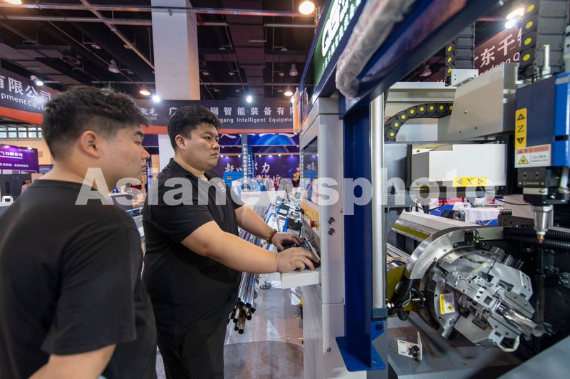 2026年4月10日,浙江省金华市,在永康市国际会展中心里,客商在考察全新的机械装备展示。