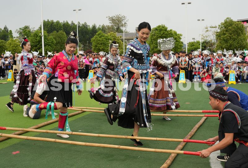 4月13日,在广西柳州市融水苗族自治县融水镇水东小学,老师身着民族服饰体验跳竹竿。