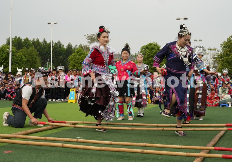 4月13日,在广西柳州市融水苗族自治县融水镇水东小学,老师身着民族服饰体验跳竹竿。