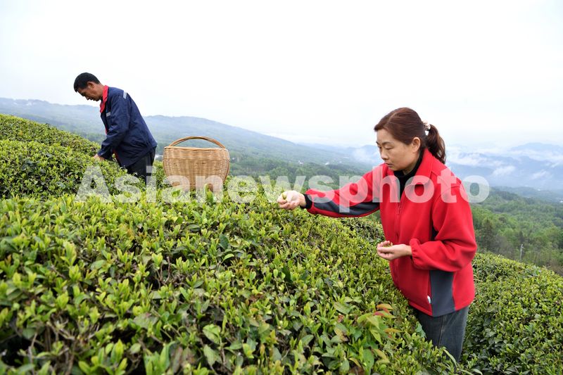 4月14日,在湖北省襄阳市保康县店垭镇锅厂村茶园,茶农在采摘茶叶。