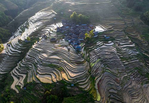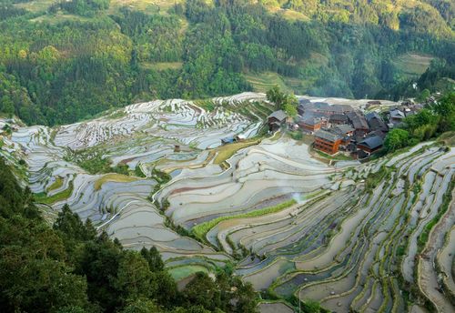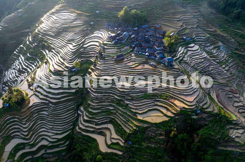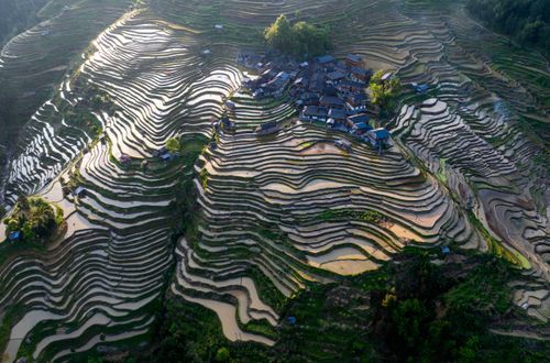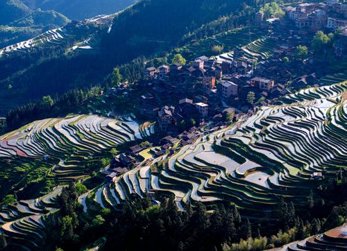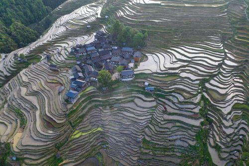2026年4月18日,贵州省从江县加榜乡加车村的高山梯田储水待插,镜面一样的稻田与线条分明的田埂、错落有致的民居相映成趣,美不胜收。