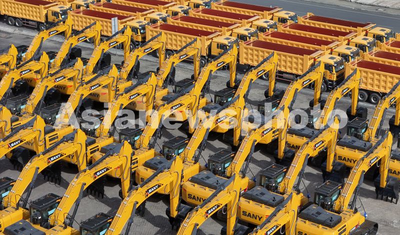 2026年4月20日,大批三一挖掘机在山东港口烟台港等待装船出口。