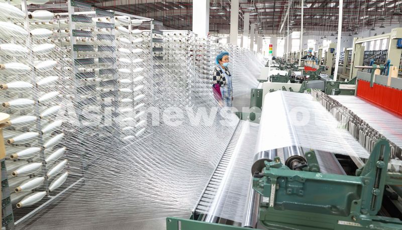2026年4月19日,江苏省淮安市金湖经济开发区,江苏泽威新材料有限公司智能化设备高效运转,工人在绝缘基材智能纺织生产线上巡检作业,加紧生产,车间一派忙碌,保障电气绝缘新材料市场稳定供应。
