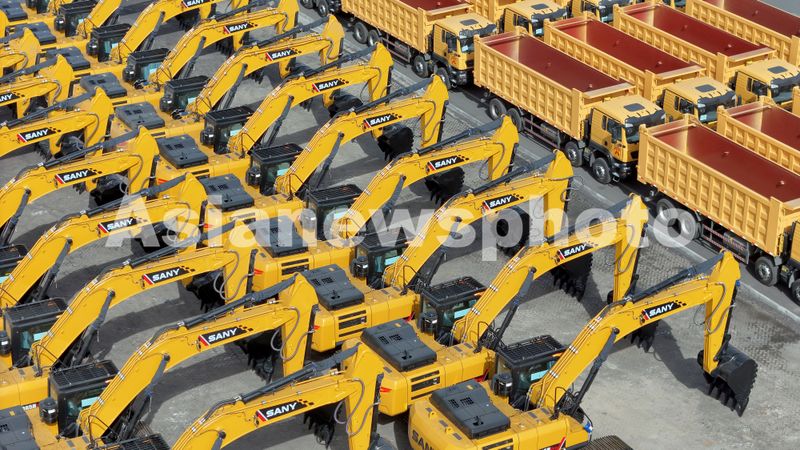 2026年4月20日,大批三一挖掘机在山东港口烟台港等待装船出口。