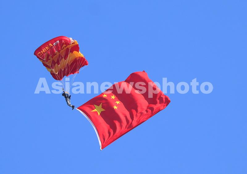 Caption:A member of the Bayi (August 1) Parachute Team performs during an activity celebrating the 70th founding anniversary of the Chinese People's Liberation Army (PLA) air force in Changchun, Jilin Province, October 17, 2019. The five-day activity, where the PLA air force will showcase weapons and equipment and offer aerobatic shows to celebrate its 70th founding anniversary, kicked off here on Thursday. The audience can feast their eyes on aerobatic flights, parachute shows, combat exercises of third-generation fighters and demonstrations of airborne special force. A total of 35 aircraft of 10 types will perform aerobatics, including J-20 stealth fighter, Y-20 transport aircraft and J-16 fighter. With 19 aircraft included, the air force selected 71 pieces of equipment for the static display to showcase the capacity of air combat, strategic delivery, early warning and detection, information support and air defense and anti-missile.