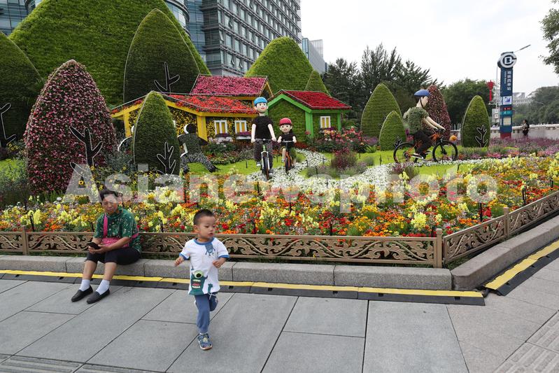 A boy runs in front of a flowerbed themed "beautiful life" at the southwest corner of Xidan, Beijing, September 20, 2019. With China's National Day around the corner, flowerbeds marking the occasion have appeared along the streets of Beijing, attracting many selfie-takers.