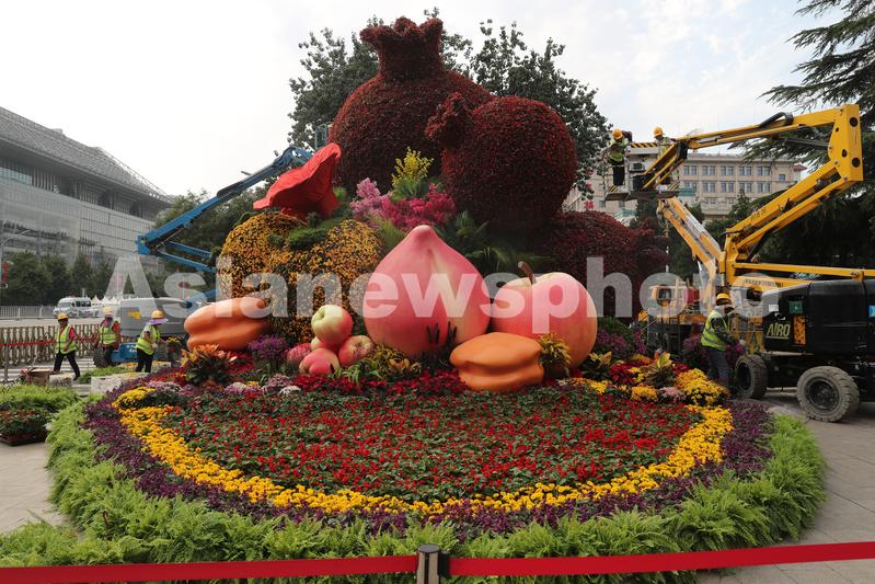 Workers arrange the flowerbed "Ethnic unity" near the Cultural Palace of Nationalities in Beijing, September 20, 2019. With China's National Day around the corner, flowerbeds marking the occasion have appeared along the streets of Beijing, attracting many selfie-takers.