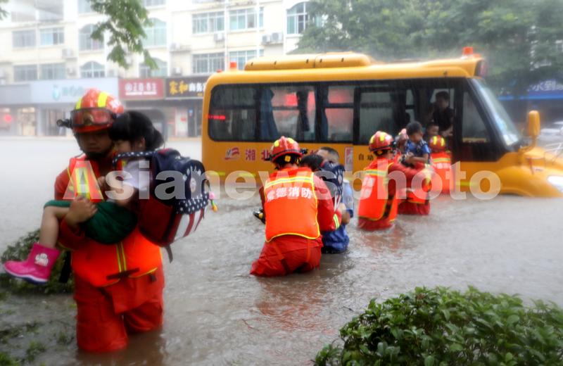Caption:Police and firefighters form a relay chain to rescue children from a school bus that was stalled in floodwaters in Changde, Hunan province, July 18, 2019. Many roads were flooded after torrential rains struck the city.