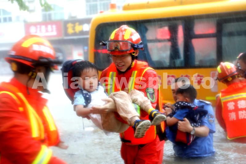 Caption:Police and firefighters form a relay chain to rescue children from a school bus that was stalled in floodwaters in Changde, Hunan province, July 18, 2019. Many roads were flooded after torrential rains struck the city.