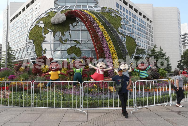 People pose for photos in front of a flowerbed themed "community of common destiny" at the northwest corner of Xidan, Beijing, September 20, 2019. With China's National Day around the corner, flowerbeds marking the occasion have appeared along the streets of Beijing, attracting many selfie-takers.
