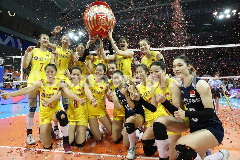 Players of China celebrate victory after the women's Pool B match between China and Turkey at the 2019 FIVB Tokyo Volleyball Qualification in Ningbo, east China's Zhejiang province, August 4, 2019.