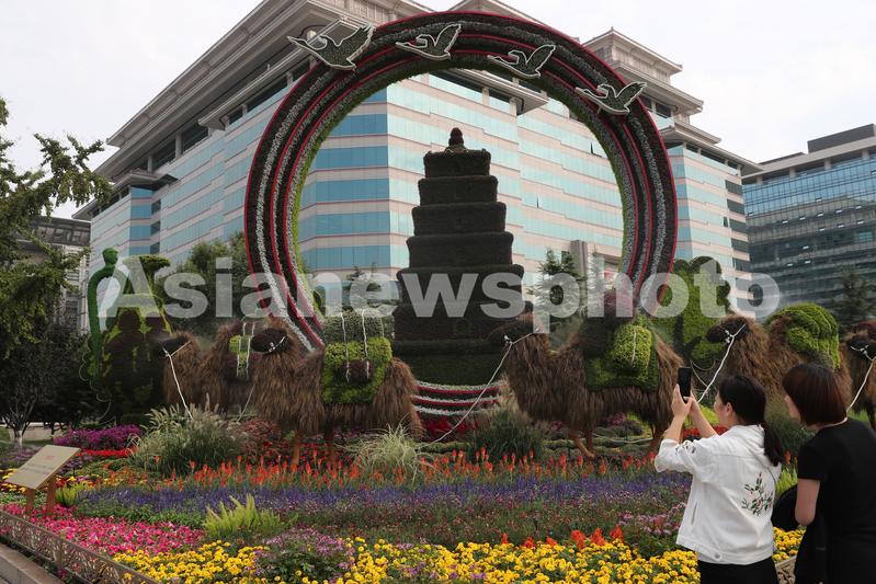 People take photos of a flowerbed themed "road to civilization" at the southeast corner of Xidan, Beijing, September 20, 2019. With China's National Day around the corner, flowerbeds marking the occasion have appeared along the streets of Beijing, attracting many selfie-takers.