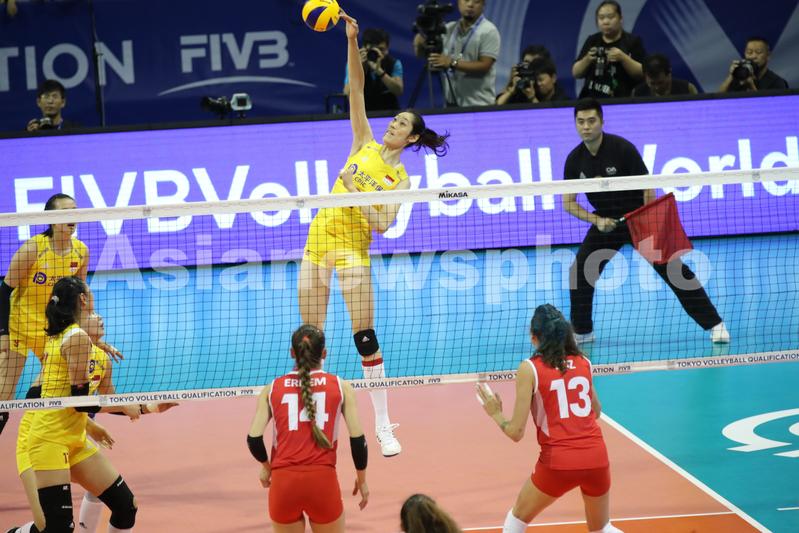 Zhu Ting (top) of China spikes during the women's Pool B match between China and Turkey at the 2019 FIVB Tokyo Volleyball Qualification in Ningbo, east China's Zhejiang province, August 4, 2019.