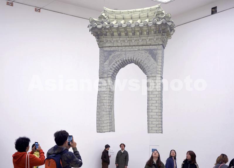 People appreciate the fiber art work The Door at the third Hangzhou Fiber Art Triennial held in Hangzhou, Zhejiang province, November 26, 2019. Seventy-eight fiber art works from 40 artists (groups) from 18 countries and regions are showcased at three venues in Zhejiang Art Museum, China Academy of Art Art Museum and China National Silk Museum, Hangzhou.
