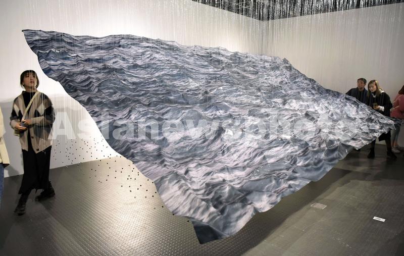 People appreciate the fiber art work Elegy at the third Hangzhou Fiber Art Triennial held in Hangzhou, Zhejiang province, November 26, 2019. Seventy-eight fiber art works from 40 artists (groups) from 18 countries and regions are showcased at three venues in Zhejiang Art Museum, China Academy of Art Art Museum and China National Silk Museum, Hangzhou.