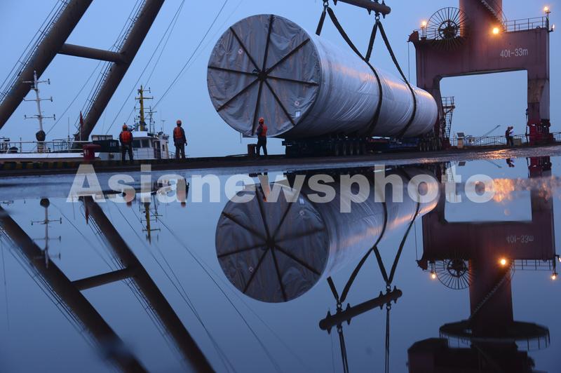 The first offshore wind tower manufactured by the China Construction Industrial & Energy Engineering Group Wuzhou Co is lifted at the Nanjing Port, April 23, 2019. (Photo by Ji Ningxin)