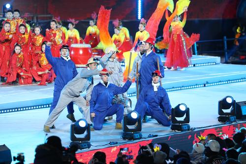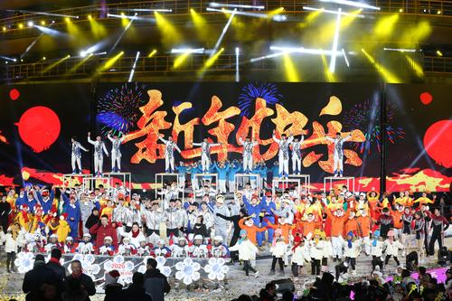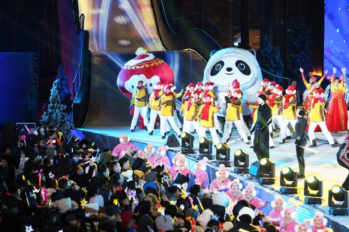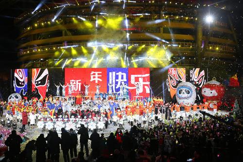 Actors perform during a New Year's Eve countdown celebration at the Shougang Park in Beijing, December 31, 2019. A New Year's Eve countdown celebration cum opening ceremony of the 4th Beijing Ice and Snow Cultural Tourism Festival is held here on Tuesday.