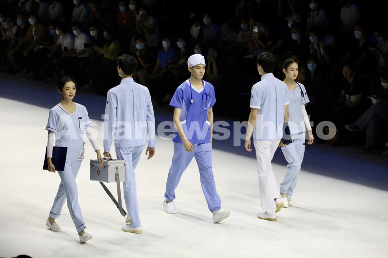 Models present a series of newly designed medical-themed clothes at China Fashion Week as a way to pay tribute to medical workers, in Beijing, on September 11, 2021.