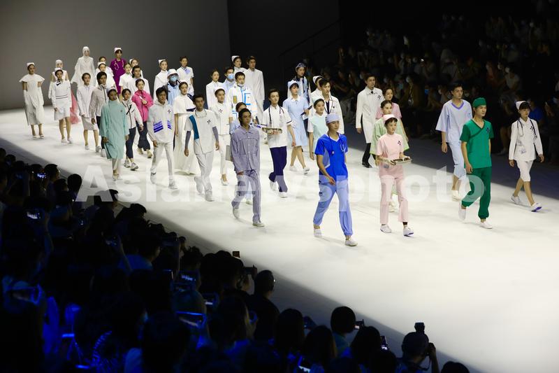 Models present a series of newly designed medical-themed clothes at China Fashion Week as a way to pay tribute to medical workers, in Beijing, on September 11, 2021.