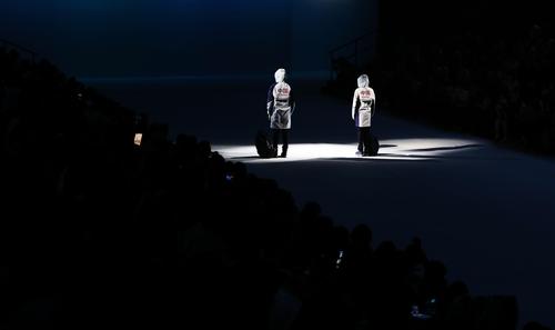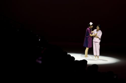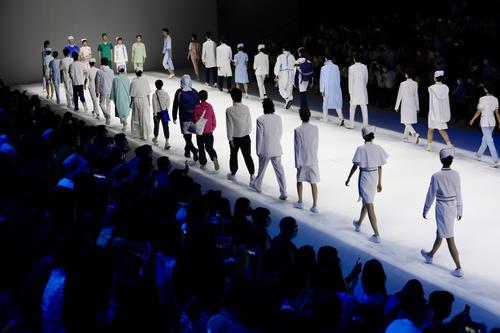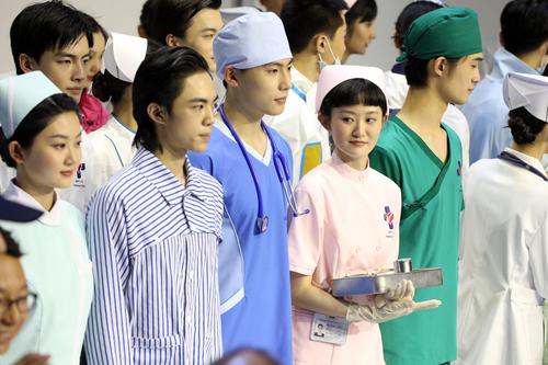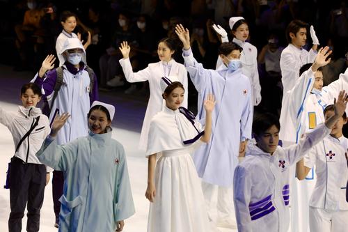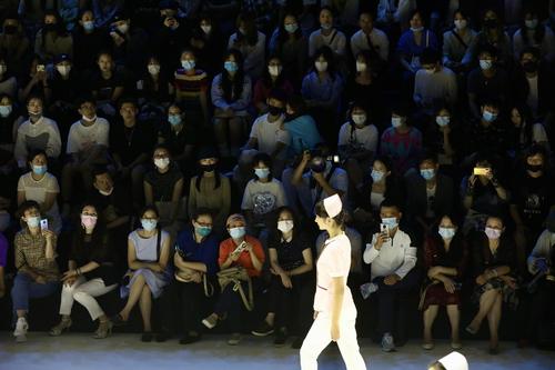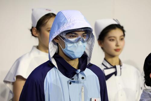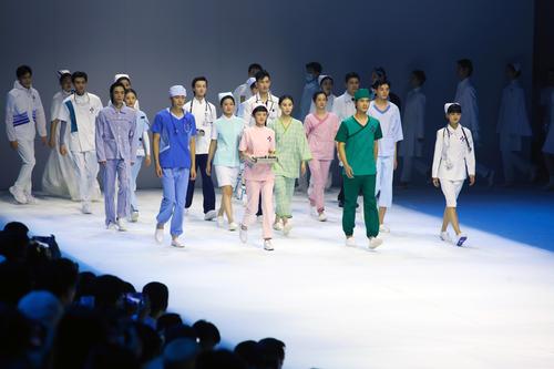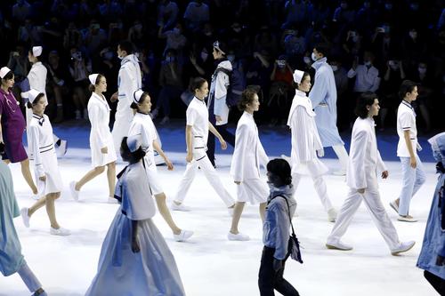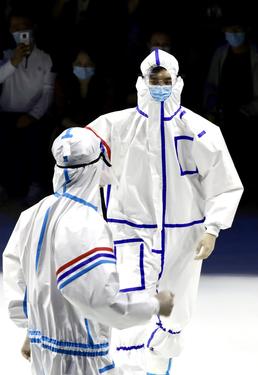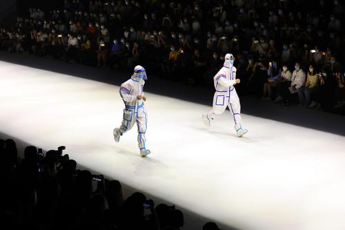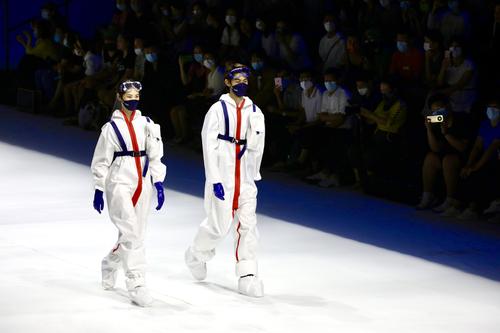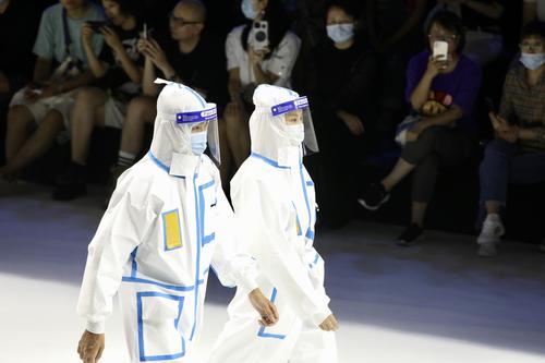Models present a series of newly designed medical-themed clothes at China Fashion Week as a way to pay tribute to medical workers, in Beijing, on September 11, 2021.