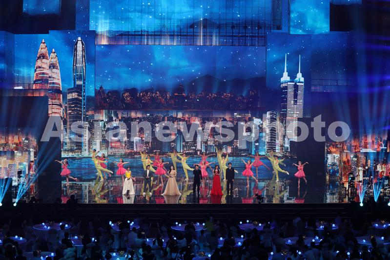 Singers and dancers perform at the Mid-Autumn Festival Concert in the Greater Bay Area in Shenzhen, Guangdong province, on September 21, 2021. More than 100 renowned filmmakers and musicians from the Chinese mainland, Hong Kong, Macao and Taiwan gathered at the concert to celebrate the festival.