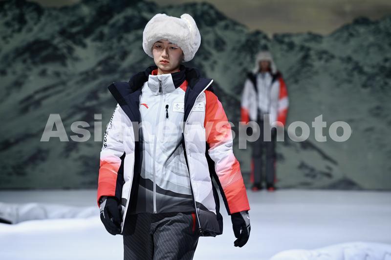 Models display the Beijing 2022 uniforms for technical officials on the occasion of the 100-day countdown to Beijing 2022 Winter Olympics in Beijing, on October 27, 2021.