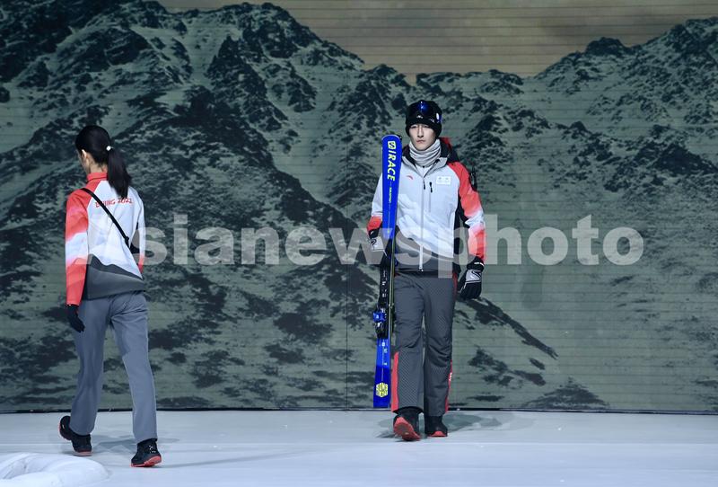 Models display the Beijing 2022 uniforms for technical officials on the occasion of the 100-day countdown to Beijing 2022 Winter Olympics in Beijing, on October 27, 2021.