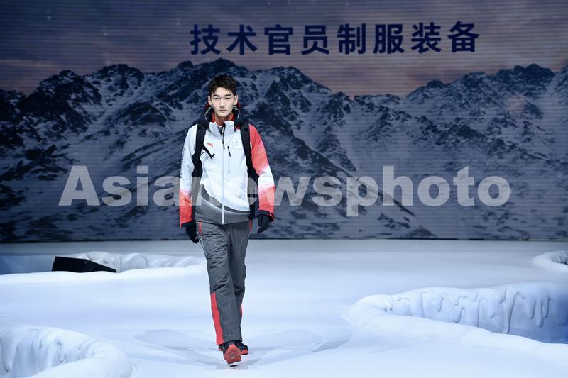 A model displays the Beijing 2022 uniforms for technical officials on the occasion of the 100-day countdown to Beijing 2022 Winter Olympics in Beijing, on October 27, 2021.