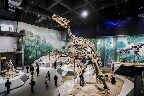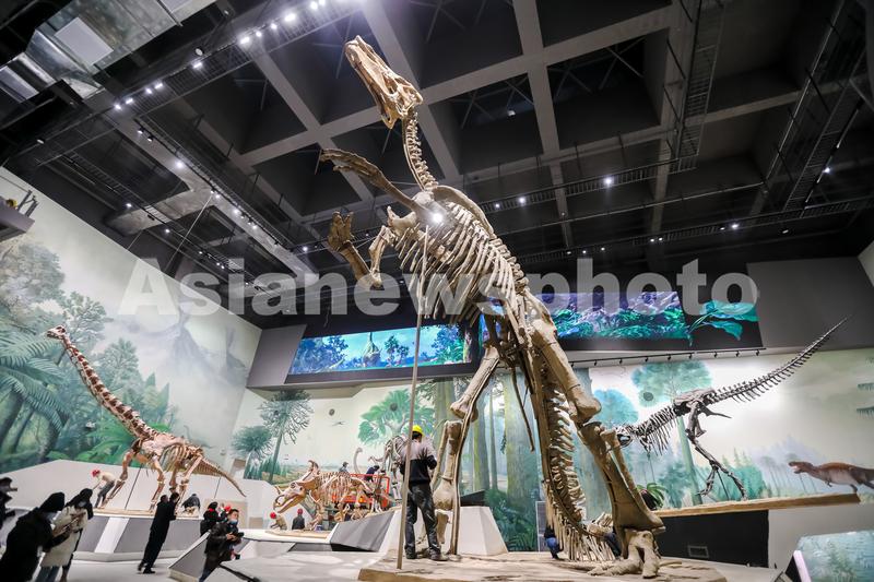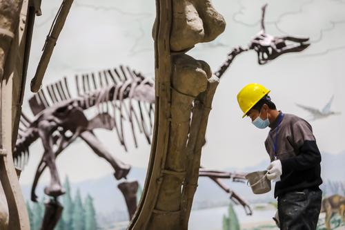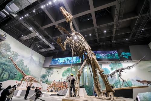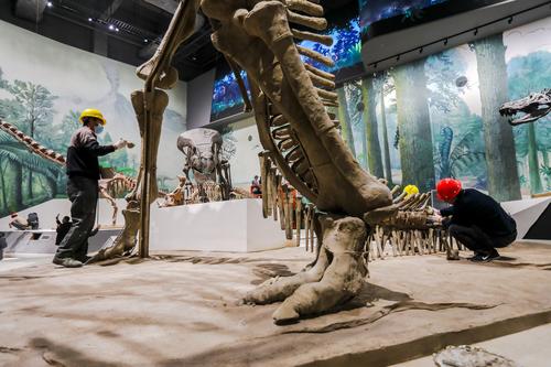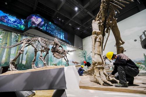 Caption:Workers perform maintenance on a skeleton of Shantungosaurus giganteus, the largest hadrosaur, or duck-billed dinosaur, ever found, at Shandong Museum in Jinan, Shandong province, on January 17, 2022. They were preparing for a permanent exhibition featuring the giant creature-14 meters long and standing up to 8 meters high-which was found in the province in 1964.