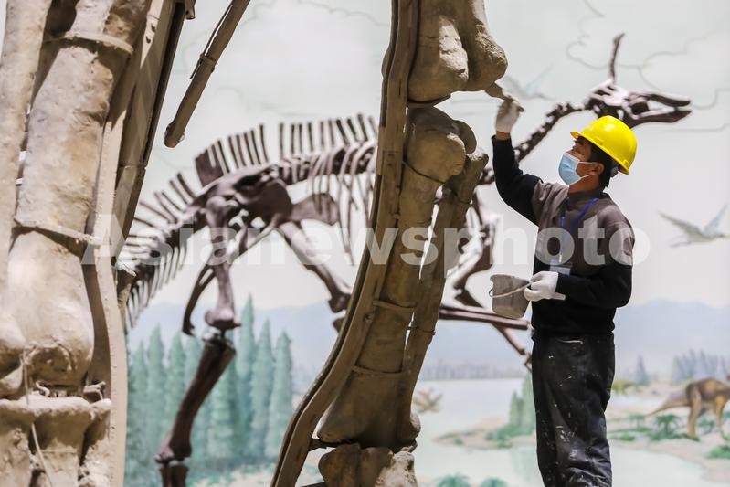Caption:Workers perform maintenance on a skeleton of Shantungosaurus giganteus, the largest hadrosaur, or duck-billed dinosaur, ever found, at Shandong Museum in Jinan, Shandong province, on January 17, 2022. They were preparing for a permanent exhibition featuring the giant creature-14 meters long and standing up to 8 meters high-which was found in the province in 1964.