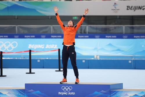 Ireen Wust of Netherlands celebrates on the podium after winning the women's 1,500m of speed skating at the Beijing Winter Olympics on February 7, 2022..