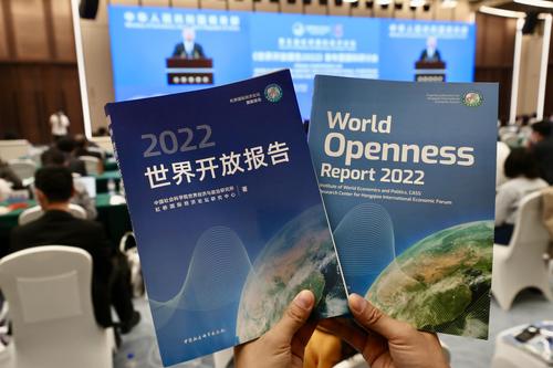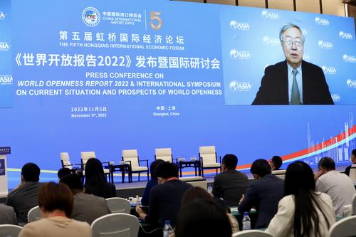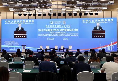 Participants attend the press conference on World Openness Report 2022 & International Symposium on Current Situation and Prospects of World Openness during the fifth Hongqiao International Economic Forum in Shanghai, November 5, 2022.