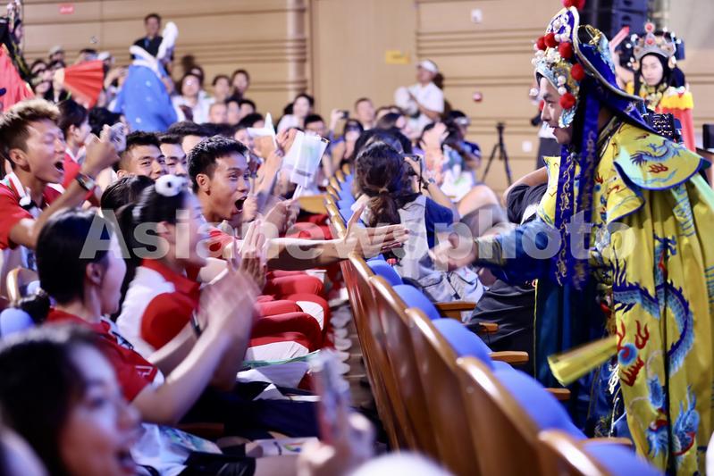 A face-changing performer greets spectators during the gala show, on July 31, 2023. The spectacular "Youth in Time" 31st World University Summer Games Athletes' Gala took place tonight at the ASEAN Art Centre Theater, nestled within the Chengdu FISU Games Village in Chengdu, the capital of Sichuan province.