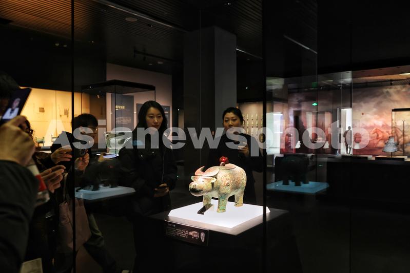 Caption:Visitors admire a bronze figurine on display at the new building of the Yinxu Museum, which opened to the public on February 26, 2024, in Anyang, Henan province. The new building boasts an exhibition area of 22,000 square meters, where nearly 4,000 cultural relics, including bronzeware, pottery and jade objects, are on display. The expanded museum is the first national archaeological museum to comprehensively present the civilization of the Shang Dynasty (1600 BC-1046 BC). The museum's old building was built in 2005.