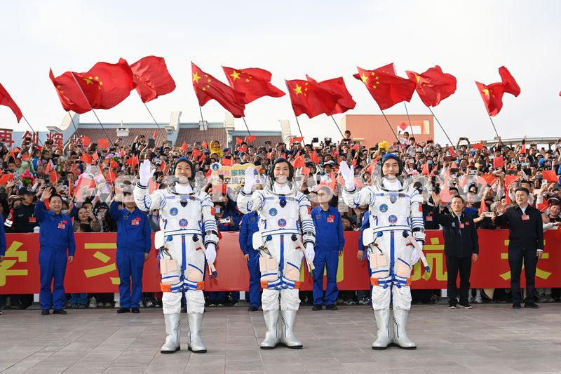 Chinese taikonauts Ye Guangfu (R), Li Cong (C) and Li Guangsu attend a see-off ceremony at the Jiuquan Satellite Launch Center in northwest China on April 25, 2024. A see-off ceremony for three taikonauts of the Shenzhou-18 crewed space mission was held on Thursday at the Jiuquan Satellite Launch Center in northwest China.
