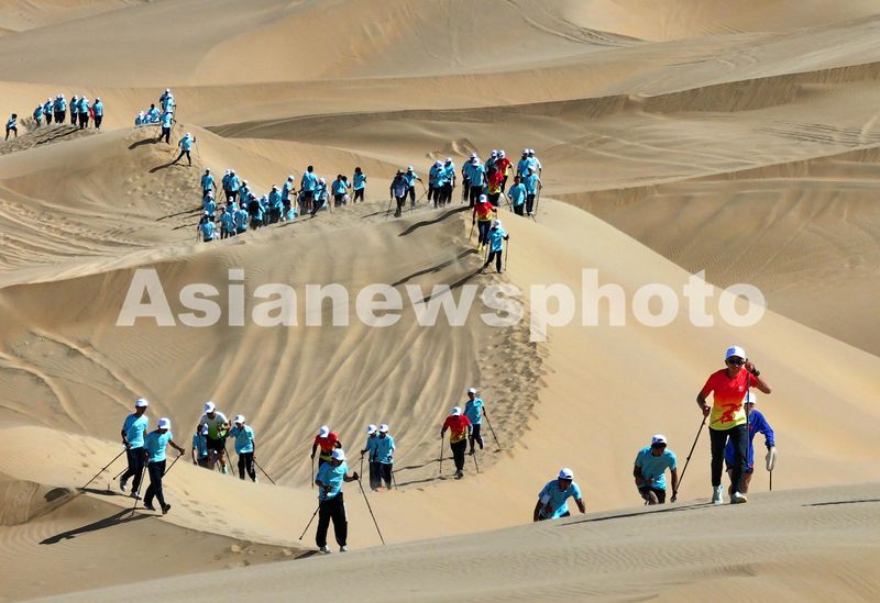 Caption:Sports enthusiasts participate in a 10-kilometer Nordic walking competition in the Jinshaling Desert in Ordos, Inner Mongolia autonomous region, on June 25, 2024. Nearly 1,000 contestants competed in the scenic outdoor sports event.